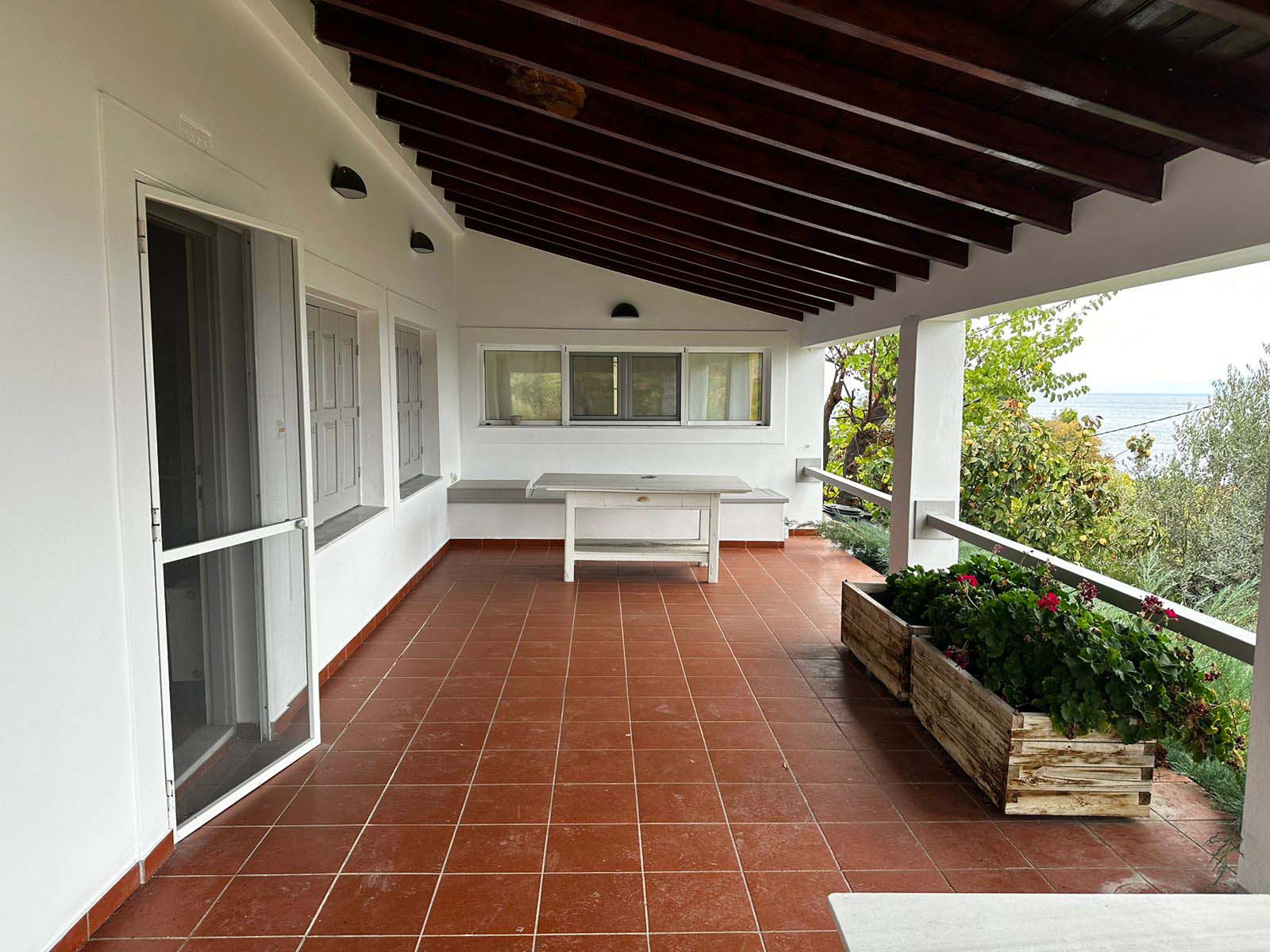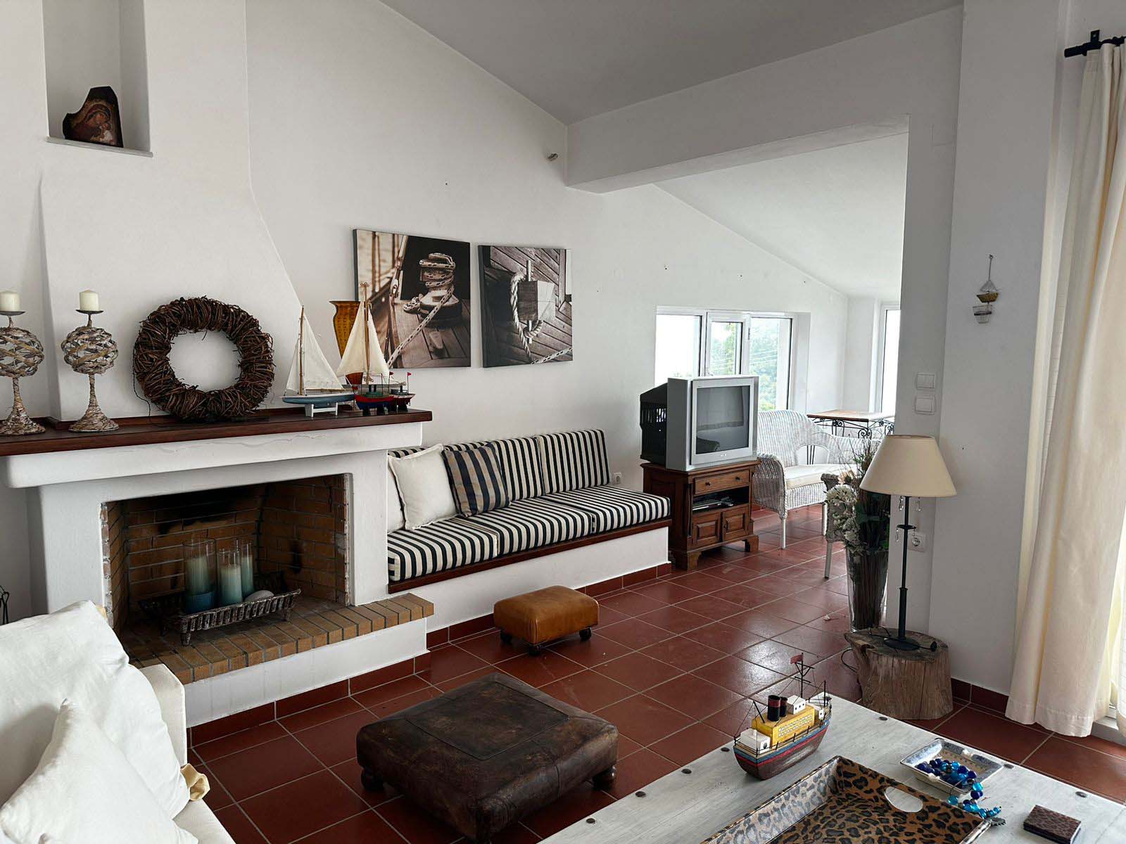 Arranged over two levels, the house features two living rooms and a well-appointed kitchen, connected by an internal staircase. The layout is airy and bright, with large windows and sea-facing views throughout. Both bedrooms are generously sized, and two fireplaces add a warm, rustic touch. The home includes tile flooring, aluminum window frames, and window screens for added comfort.